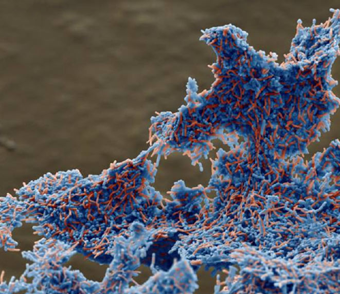 Prikaz koagregata L. reuteri (plavo) i H. pylori (crveno) dobiven pretražujućom elektronskom mikroskopijom (SEM)